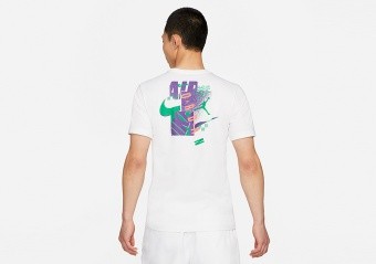 Das Jordan Air Futura-T-Shirt aus weicher und leichter Baumwolle kommt gerade rechtzeitig für die neue Saison. Es zeigt vorn und hinten eine Mischung verkürzter und sich überlagernder nostalgischer Grafiken.