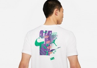 Das Jordan Air Futura-T-Shirt aus weicher und leichter Baumwolle kommt gerade rechtzeitig für die neue Saison. Es zeigt vorn und hinten eine Mischung verkürzter und sich überlagernder nostalgischer Grafiken.